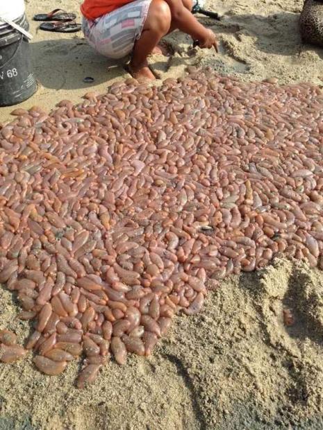 Hoá ra những con vật có hình dáng kỳ lạ này đều có thể ăn được! Người dân địa phương gọi những sinh vật này là “Acaudina molpadioides”. Khi thủy triều lên cao loài Acaudina sẽ bị dạt lên trên bờ. Người dân sẽ nhặt chúng lên và phơi nắng, thậm chí không cần phơi nắng cũng có thể ăn ngay, không những vậy hương vị còn rất thơm ngon.