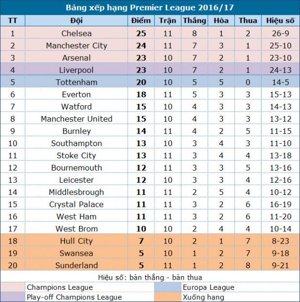 Chiến thắng trước Everton giúp Chelsea giành trận thắng thứ năm liên tiếp tại Ngoại hạng Anh. Cùng với việc Man City bị cầm hòa 1-1 bởi Middlesbrough, Chelsea đã vượt qua đối thủ để lên ngôi đầu bảng với 25 điểm.
