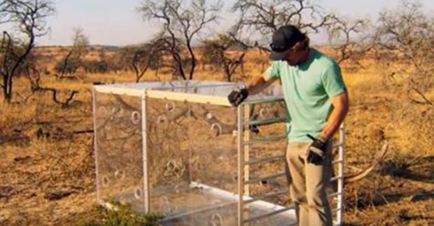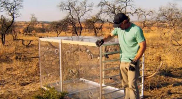 Chiếc hộp kính được đặt ở vùng đất trống trải, khô cằn.