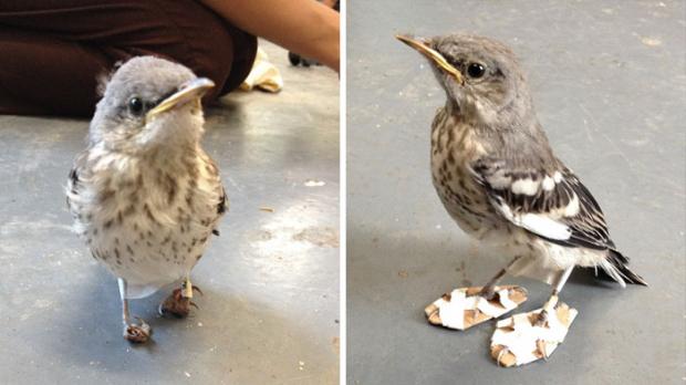 Chú chim nhỏ bị thương ở chân và ‘đôi dép’ này đã giúp nó đứng vững hơn.