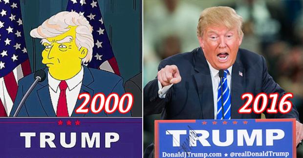 Bộ phim Gia đình Simpson (The Simpsons) đã dự đoán sự nổi lên của Donald Trump một cách vô cùng kỳ lạ. Bộ phim hoạt hình đã từng nhắc tới việc một tỉ phú trở thành tổng thống Mỹ trong tập “Bart To The Future” (tạm dịch: Đi đến tương lai) phát sóng năm 2000. Trong đó, Trump đã bị chế nhạo không thương tiếc. Và đến ngày 8/11 năm nay, Donald Trump đã thực sự trở thành tổng thống. (Xem thêm)