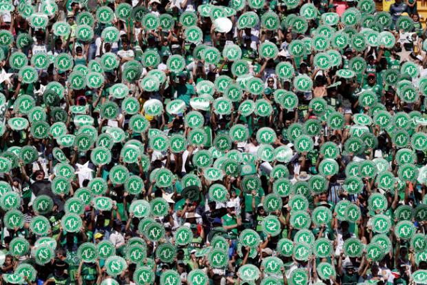 Thủ môn Jakson Follmann, một trong số 3 cầu thủ may mắn thoát chết, ngồi xe lăn mang chiếc Cúp Copa Sudamericana vào sân. Các cầu thủ đã không ngăn được nước mắt khi nhớ lại thảm kịch.