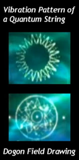 Trên: mô thức dao động điển hình của một dây lượng tự, Dưới: Đồ hình của người Dogon biểu thị cho 266 hạt giống hay dấu hiệu của thần Amma.