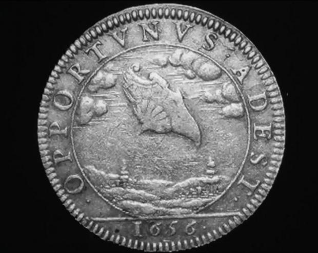Đồng tiền cổ có hình ảnh phi thuyền không gian (Ảnh: Epoch Times France)