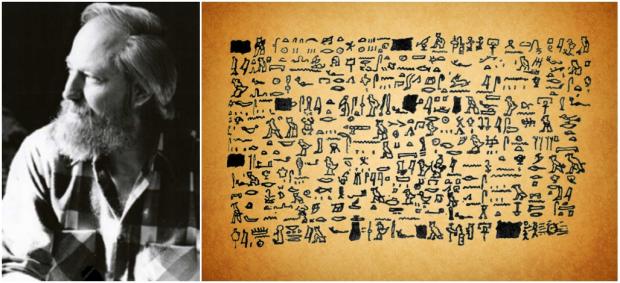 R. Cedric Leonard và bản sao chữ tượng hình của cuộn giấy cói Tulli