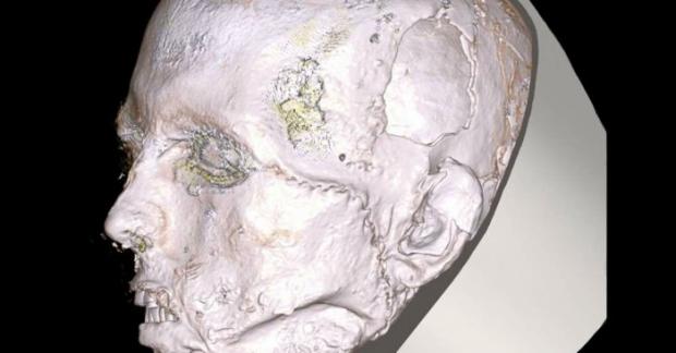 Kết quả chụp CT cho thấy vài thương tích trên hộp sọ. Có vẻ như gương mặt của người này đã bị đánh rất mạnh bởi vật cùn, tạo nên một vết nứt lớn từ hốc mắt xuống xương hàm. Trên đầu xuất hiện một lỗ nhỏ là kết quả của việc loại bỏ nội tạng trong quá trình ướp xác.