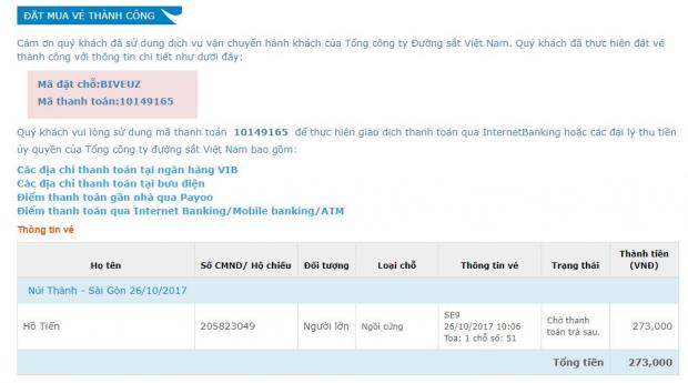 Lưu ý: Bạn cần thanh toán trong khoản thời gian 48 giờ đồng hồ sau khi đặt vé xong. Bạn cần ghi lại mã đặt chỗ và mã thanh toán hoặc in thông tin bằng nút In vì khi thanh toán vé sẽ cần những thông tin này, hoặc có thể kiểm tra thông tin khi hệ thống gửi về email của bạn .