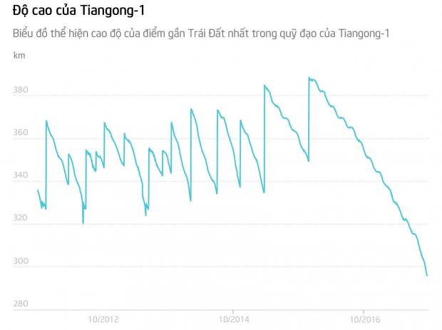 Kể từ đó đến nay, độ cao quỹ đạo của trạm vũ trụ này đã giảm một cách đều đặn. Trong vài tuần trở lại đây, khi Tiangong-1 bắt đầu xâm nhập vào vùng khí quyển của Trái Đất, tốc độ rơi trở nên nhanh hơn bao giờ hết. 'Điểm gần Trái Đất trong quỹ đạo của nó giờ đây nằm dưới mức 300 km, trong một bầu khí quyển dày đặc hơn nên tốc độ rơi cũng cao hơn', Jonathan McDowell, nhà nghiên cứu vật lý thiên văn nổi tiếng đến từ Đại học Harvard cho biết.