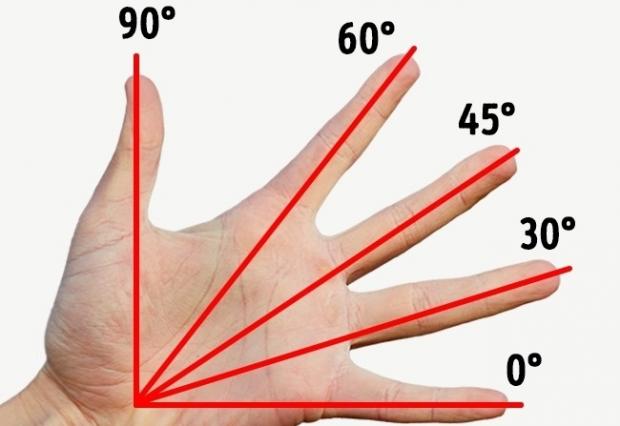 Xoè rộng các ngón tay, đặt bàn tay lên bề mặt bạn muốn đo. Ngón út nằm dưới cùng nghĩa là 0°. Góc giữa ngón cái và ngón tay út sẽ đại diện cho 90°, các góc giữa ngón út và các ngón tay khác là 30°, 45° và 60°.
