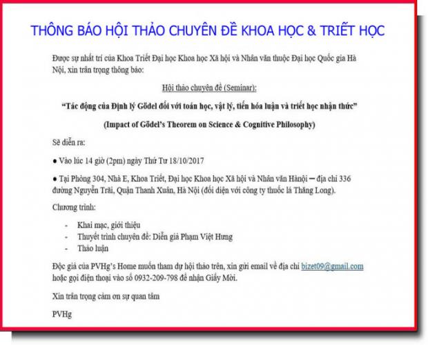 Vào lúc 14 giờ ngày Thứ Tư 18/10/2017, tại Phòng 304, Nhà E, Khoa Triết, Đại học Khoa học Xã hội và Nhân văn Hà Nội ─ địa chỉ 336 đường Nguyễn Trãi, Quận Thanh Xuân, Hà Nội (đối diện với công ty thuốc lá Thăng Long), sẽ tổ chức hội thảo “Tác động của Định lý Gödel đối với khoa học và sự nhận thức của con người” do GS Phạm Việt Hưng chủ trì. Quý độc giả quan tâm đến sự kiện này có thể đến tham dự.