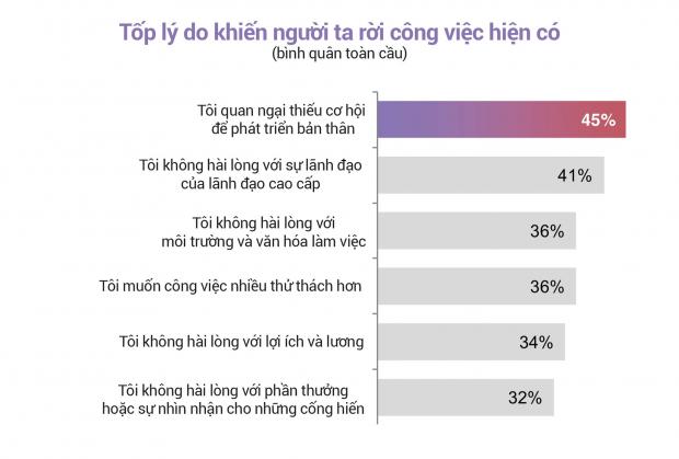 Nghiên cứu lần này cho thấy không gian phát triển sự nghiệp bản thân là một trong số những lý do “tích cực” khiến người ta từ bỏ công việc hiện tại, trái ngược hoàn toàn với suy nghĩ của nhiều người về lý do nghỉ việc (như sếp quá khó tính, thời gian làm việc quá nhiều hoặc cơ sở vật chất tồi tệ).