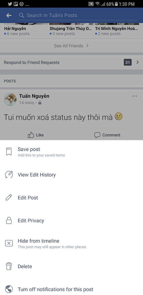 Nếu lỡ đăng status nào đó mà không muốn người khác thấy, bạn có thể dùng điện thoại để gỡ hoặc tạm chỉnh qua chế độ Only Me.