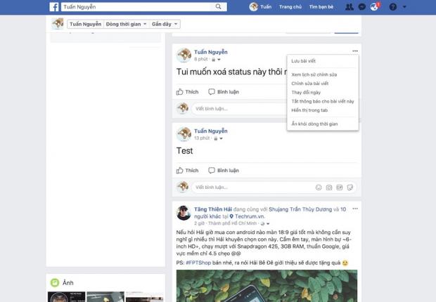 Điều này xảy ra trên cả hai hệ điều hành macOS và Windows, may mắn là ứng dụng trên di động vẫn có thể xoá được. Trên nền web, khi bạn click vào menu ba chấm thuường dùng để chỉnh sửa hay xoá status thì giờ đây tuỳ chọn xoá bài viết đã không còn nữa. Nếu bạn dùng điện thoại vào website facebook ở đường dẫn di động m.facebook.com thì vẫn còn xoá bài được, nhưng nếu chọn hiển thi trang web đầy đủ dưới dạng desktop thì sẽ không còn.