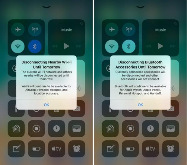 Trên Control Center của các mẫu iPhone còn lại, có hai 'pop-up' mới hiển thị thông tin khi sử dụng các nút truy cập nhanh cho Wi-Fi hoặc Bluetooth. Hiển thị 'pop-up' này giải thích cụ thể rằng Bluetooth và Wi-Fi sẽ bị tắt tạm thời nếu người thực hiện tắt nhanh từ Control Center chứ không phải tắt hoàn toàn.
