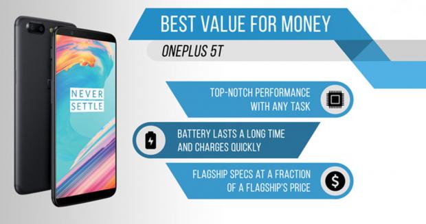 OnePlus 5T có thể không chống nước, sạc không dây hay tốc độ làm tươi màn hình cao nhưng nó vẫn là một ngôi sao trong năm 2017. Điện thoại nổi bật với giá bán phải chăng đi kèm với hiệu suất nhanh chóng, tuổi thọ pin vượt trội, chất lượng màn hình đẹp và khả năng chụp ảnh rất tốt.