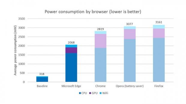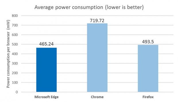 Thử nghiệm của Microsoft gồm 4 chiếc Surface chạy các trình duyệt khác nhau: Edge, Firefox, Opera và Chrome. Cả 4 máy đều được bật một ứng dụng giả lập việc lướt web, gồm có tác vụ mở website, cuộn chuột, xem video… Kết quả cho thấy máy tính chạy Edge tiêu thụ ít điện nhất, thấp hơn từ 36 - 53% so với các trình duyệt khác. Xếp sau lần lượt là Chrome, Opera (chế độ tiết kiệm) và Firefox.