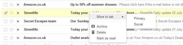 phải vào email đã bị xếp nhầm chỗ, chọn 'di chuyển đến”, chọn tab bạn muốn.