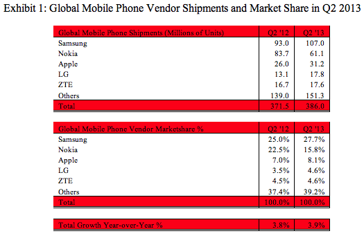 Strategy Analytics ước tính Samsungđã bán ra 107 triệu điện thoại di động trong quý 2, chiếm 27,7% thị trường toàn cầu; Nokiabán ra 61,1 triệu điện thoại khiến thị phần xuống còn 15,8% quý vừa qua, so với 22,5% quý 2 năm ngoái. Thị phần của Appletăng từ 7,1% cùng kì lên 8,1% với 31,2 triệu iPhone bán ra; LG và ZTE lần lượt bán ra 17,8 triệu và 17,6 triệu thiết bị, đều chiếm 4,6% thị trường toàn cầu.
