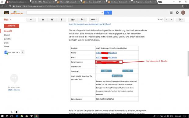 Sau đó một lát (tầm vài giây thôi, cơ mà theo phản hồi thì đã có một số trường hợp phải đến 30 phút) sẽ có một mail khác gửi về. Mở mail đó lên và nhập license key (mã bản quyền) có trong bảng nằm giữa mail vào phần mềm (vị trí dưới đây).