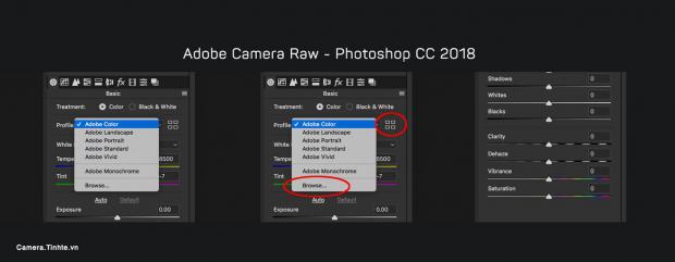 Ngoài việc thay đổi vị trí, Adobe còn nâng cấp với việc thêm nhiều Profile hơn, cụ thể với Profile Camera Raw, bây giờ Adobe đã thêm vào 6 Profile khác ngoài Profile Adobe Standard trước đây là: Adobe Color, Adobe Monochrome, Adobe Landscape, Adobe Neutral, Adobe Portrait và Adobe Vivid.