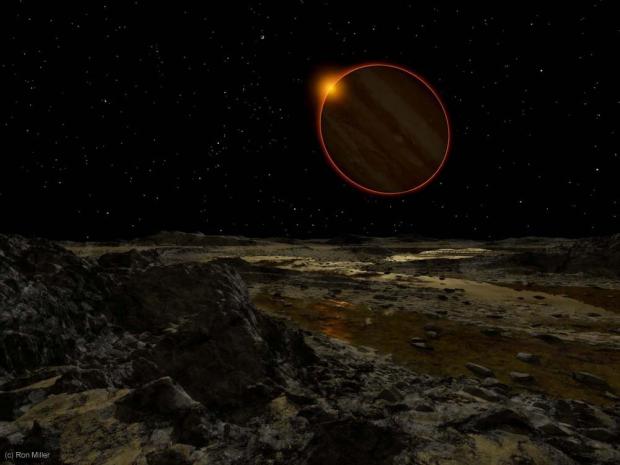 Mặt Trời nhìn từ Europa, một trong những mặt trăng của sao Mộc. Mà sao Mộc lại cách Mặt trời khoảng 779 triệu km, gấp 5,2 lần khoảng cách giữa Trái đất và Mặt trời. Ánh sáng Mặt Trời xuyên qua bầu khí quyển dày đặc của hành tinh, tạo thành vòng nhẫn màu đỏ sậm bao quanh sao Mộc.
