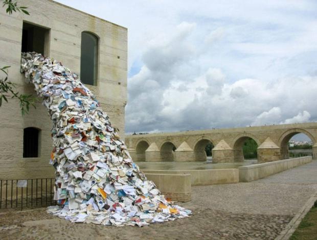 10. Tác phẩm có tên Biografies với hình ảnh hàng ngàn cuốn sách bìa mềm bị đổ ra khỏi cửa sổ này do nghệ sỹ Alicia Martin tạo nên trong 3 tuần bằng cách gắn 70.000 cuốn sách thành một khối khổng lồ.