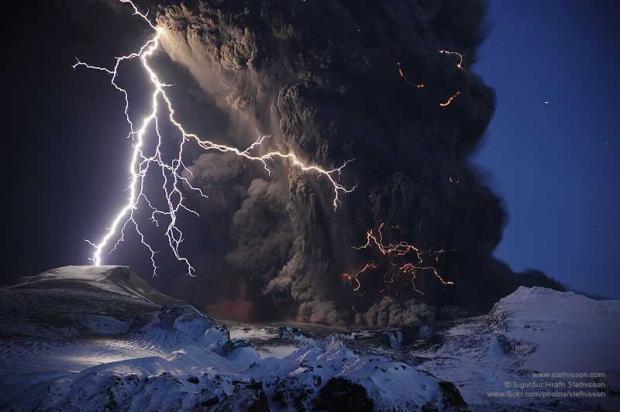 11. Trong một đợt núi lửa phun đầy tro bụi thì hình ảnh sét đánh càng khiến cảnh tượng thêm hãi hùng. Khoảnh khắc 'đắt hơn vàng' này được ghi lại bởi nhiếp ảnh gia Sigurdur Stefnisson ở Iceland vào tháng 8/2010.
