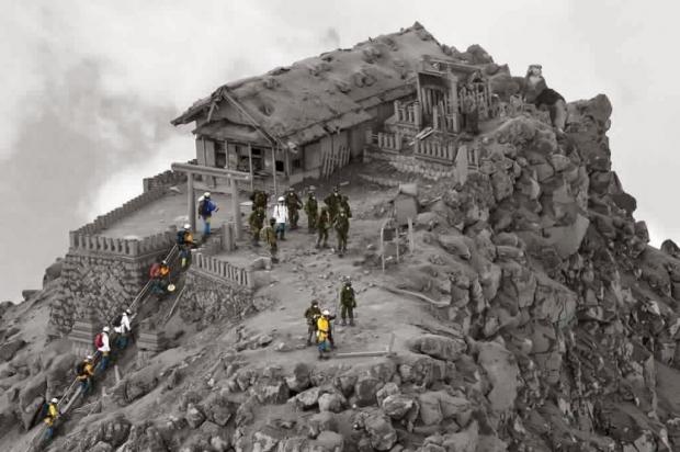 7. Hẳn sẽ có người quả quyết có sự nhúng tay của 'giới photoshop' chuyên nghiệp trong bức ảnh này. Tuy nhiên, bức ảnh này không hề bị chỉnh sửa. Đây là hình ảnh một đền thờ và khu vực xung quanh bị bao phủ bởi đám tro bụi do sự phun trào của núi lửa Ontake, Nhật Bản vào ngày 27/9/2014.