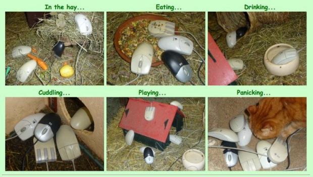 Những chú chuột máy tính ở đây vui đùa trong cỏ khô, được ăn, được uống, được chơi và thậm chí còn được sợ hãi khi một chú mèo vô tình ghé thăm.