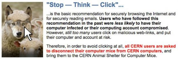Trong cảnh báo của mình, CERN nhấn mạnh rằng mọi người nên dừng lại, suy nghĩ trước khi nhấp vào liên kết. Và để tránh việc nhấp nhầm, CERN đề nghị tất cả nhân viên tháo chuột khỏi máy tính và mang tới CERN Animal Shelter for Computer Mice.