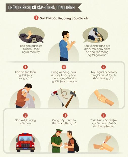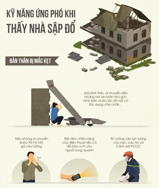 Khi thấy nhà sập, cần giữ bình tĩnh, di chuyển đến những nơi an toàn như góc nhà, bên dưới đồ vật che chắn...