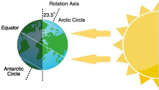 Cứ 24 tiếng Trái Đất hoàn thành 1 vòng quay quanh trục, đây là lý do tạo ra sự thay đổi giữa ngày và đêm. Ngoài ra, Trái Đất cũng quay quanh Mặt Trời và hoàn thành một vòng sau 365 ngày (một năm). Trục vuông góc với mặt phẳng quỹ đạo của Trái Đất nghiêng một góc 23,5 độ. Nếu Trái Đất nằm thẳng đứng thì mỗi ngày sẽ có 12 tiếng ban ngày và 12 tiếng ban đêm ở tất cả mọi nơi trên Trái Đất trong suốt cả năm. Nhưng thực tế là Trái Đất nằm nghiêng vì vậy mà ở vòng Bắc Cực, Mặt Trời không lặn trong suốt khoảng thời gian hạ chí và tại Cực Bắc, Mặt Trời không lặn trong 6 tháng. Tương tự như thế, ở vòng Nam Cực, Mặt Trời không lặn trong suốt khoảng thời gian đông chí và tại Cực Nam, Mặt Trời không lặn trong 6 tháng.
