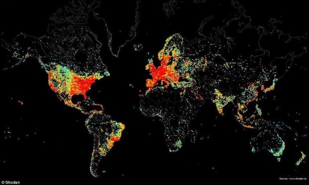 Những chấm đỏ trên bản đồ thể hiện mật độ thiết bị kết nối Internet cao nhất, màu vàng là mức thấp hơn. Các vùng màu xanh có mật độ thấp nhất còn màu đen là những vùng không có phản hồi.