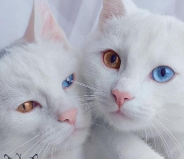 Theo chủ cặp mèo, Iriss và Abyss có bộ lông trắng và đôi mắt loạn sắc một cách hoàn toàn tự nhiên.