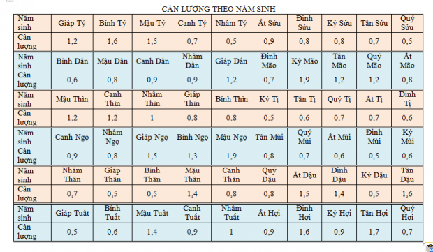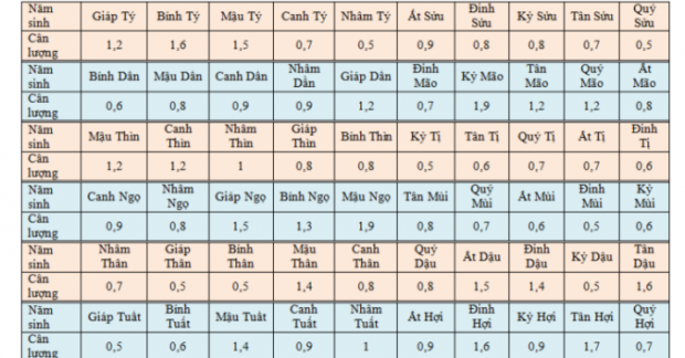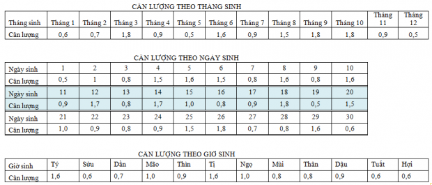 Ví dụ một người sinh giờ Tý ngày 30 tháng 2 năm Quý Mùi thì có cân lượng như sau: