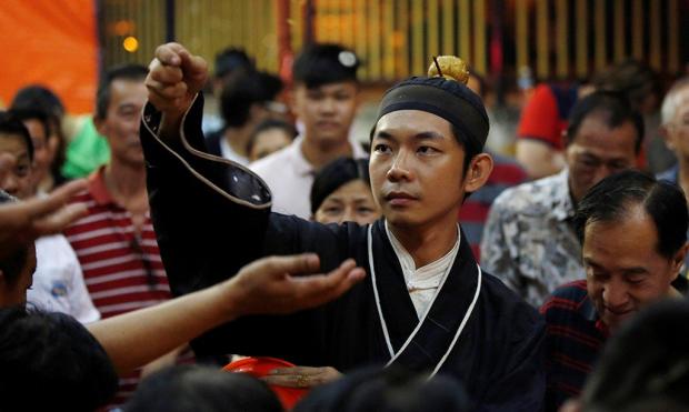 Thầy tu tung đồng xu để các tín đồ cầu may trong dịp lễ Ma Quỷ ở Malaysia. (Ảnh: Reuters).