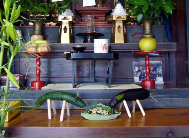 Obon là sự kiện của những người Nhật theo Phật giáo diễn ra trong 3 ngày của tháng 8 dương lịch hằng năm. Người ta tin rằng vào dịp này, linh hồn của tổ tiên trở lại trần thế để thăm người thân của họ. Trong ngày đầu tiên, người Nhật sẽ đến thăm các ngôi mộ của người thân và trang trí mộ với các loại trái cây, bánh và lồng đèn. Ngày thứ 2, họ sửa soạn bàn thờ ở nhà. Phía trên cùng của bàn thờ, người ta đặt những vật tưởng niệm về tổ tiên và cúng những món ăn chay. Những con vật làm từ dưa chuột hay cà tím được đặt lên bàn thờ, tượng trưng cho phương tiện đón rước các linh hồn. (Ảnh: savvytokyo).