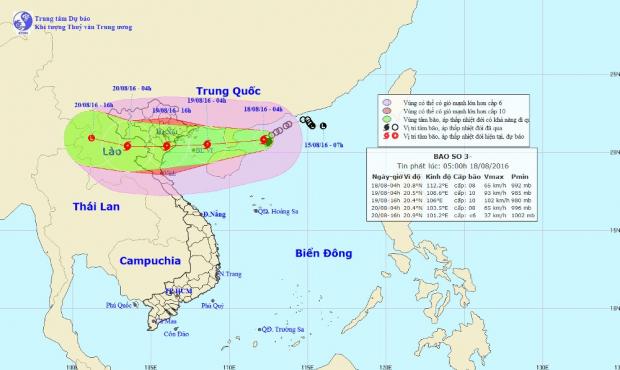 Dự báo trong 24 giờ tới, bão số 3 di chuyển chủ yếu theo hướng Tây, mỗi giờ đi được khoảng 10-15km. Đến 04 giờ ngày 19/8, vị trí tâm bão ở vào khoảng 20,5 độ Vĩ Bắc; 108,6 độ Kinh Đông, trên vùng biển Bắc Vịnh Bắc Bộ. Sức gió mạnh nhất ở vùng gần tâm bão mạnh cấp 9-10 (75-100km/giờ), giật cấp 11-13 và còn tiếp tục mạnh thêm.