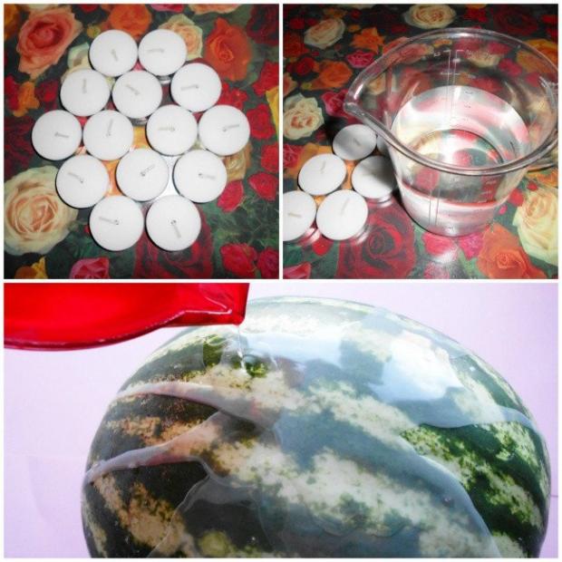Để nguội dung dịch trên khoảng 10 phút, sau đó đổ đều lên bề mặt của dưa hấu. Bạn đổ sao cho kín toàn bộ bề mặt dưa hấu và lớp sáp này dày khoảng 0,5cm nhé!