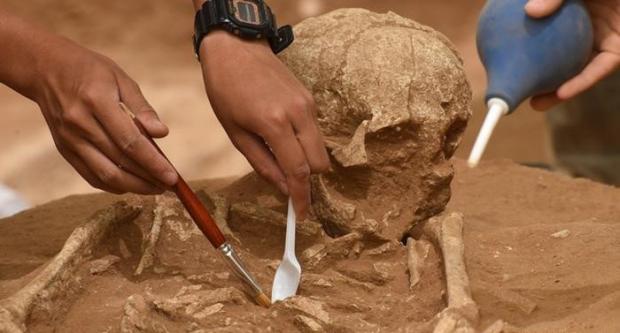 Hộp sọ người đàn ông chôn ở khu mai táng Anzhevsky, Nga, có vết phẫu thuật sọ não. (Ảnh: Reuters).