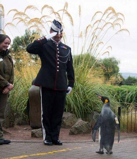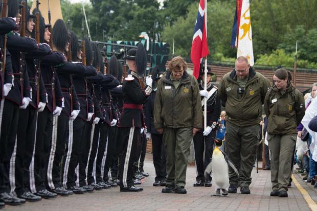 'Chúng tôi có vinh dự đón tiếp Đội cận vệ Hoàng gia Na Uy khi họ phong quân hàm mới cho chim cánh cụt hoàng đế của vườn thú, Ngài Nils Olav', Barbara Smith, giám đốc điều hành hoạt động của Hiệp hội Động vật học Hoàng gia Scotland, chia sẻ. (Ảnh: Twitter).