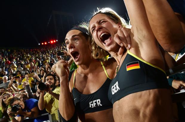 13. Vận động viên Kira Walkenhorst của Đức (trái ) và Laura Ludwig ăn mừng sau chiến thắng trận chung kết bóng chuyền bãi biển nữ giữa Brazil và Đức tại Beach Volley Arena, Rio de Janeiro, ngày 17 tháng 8 năm 2016 .