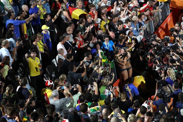 14. Hình ảnh Vận động viên Laura Ludwig và Kira Walkenhorst của Đức bị bao quanh bởi người hâm mộ và các nhiếp ảnh gia khi họ ăn mừng chiến thắng trong trận đấu giành huy chương vàng, môn bóng chuyền bãi biển nữ, ngày thi đấu thứ 12 của Olympic Rio 2016 .