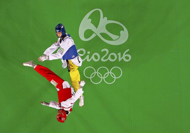 16. Vận động viên Omar Hajjami của Morocco thi đấu với Zhao Shuai của Trung Quốc trong trận tứ kết nội dung Taekwondo hạng cân 58kg Nam.
