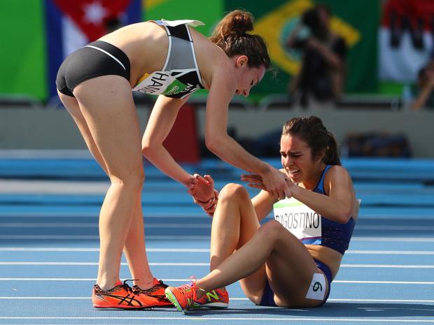 20. Hình ảnh cảm động của vận động viện Nikki Hamblin, New Zealand khi ngừng chạy để giúp vận động viên Abbey D' Agostino của Mỹ đang bị chuột rút.