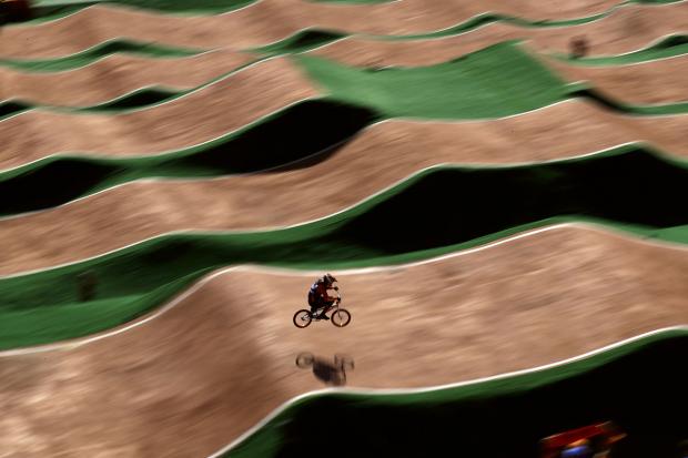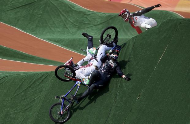 23. Vận động viên Liam Phillips của Anh, Maris Strombergs của Latvia và David Graf của Thụy Sĩ xảy ra va chạm trong lượt chạy tứ kết môn đua xe đạp địa hình BMX, vòng heat 2.