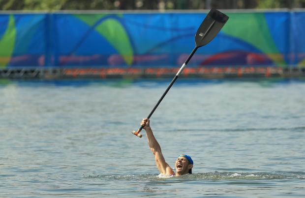 26. Hình ảnh Vận động viên Iurii Cheban của Ukraine ăn mừng sau khi giành huy chương vàng trong lượt đấu cuối giành huy chương vàng nội dung ca nô đơn 200m nam, tại sân vận động Lagoa, ngày thi đấu thứ 13 của Olympic Rio 2016.
