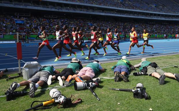 27. Hình ảnh các Nhiếp ảnh gia nằm chụp ảnh các vận động viên điền kinh đang thi đấu nội dung 5000m nam, vòng 1 vào ngày thi đấu thứ 12 của Olympic Rio 2016.