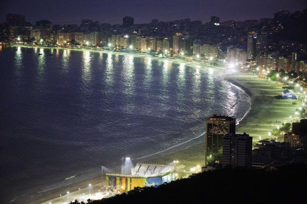 2. Hình ảnh lung linh nhìn từ trên cao của sân thi đấu bóng chuyền bãi biển tại bãi biển Copacabana trước đêm thi đấu trận chung kết giành huy chương vàng nữ giữa Đức và Brazil tại Thế vận hội mùa hè năm 2016, ngày 17 tháng 8 năm 2016.