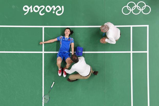 29. Vận động viên Xuerui Li của Trung Quốc bị chấn thương năm trên cho các bác sĩ chăm sóc trong trận bán kết cầu lông nữ, đối đầu với Carolina Marin của Tây Ban Nha, ngày thi đấu thứ 13, Olympic Rio 2016.